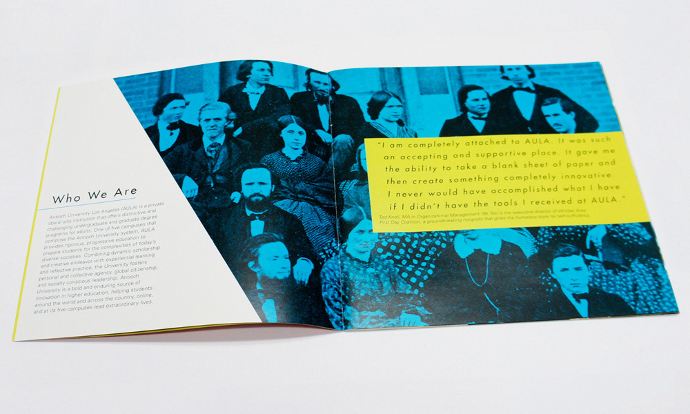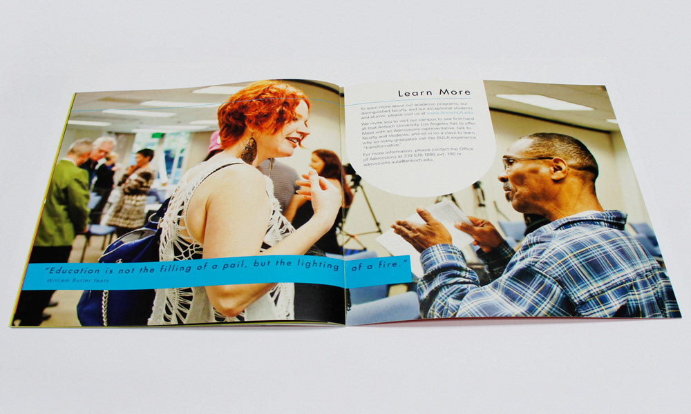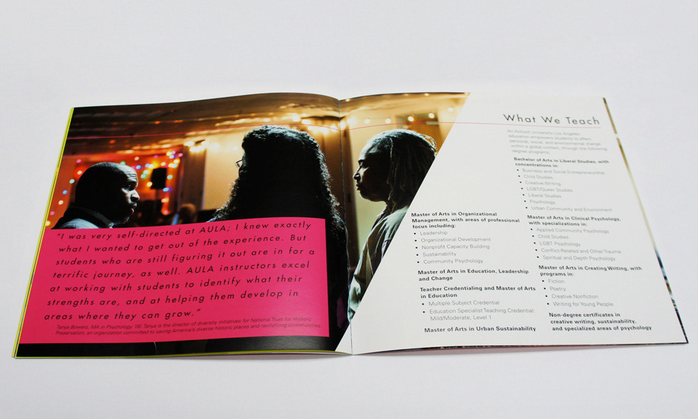 Antioch University Los Angeles' look book was created to help give an instant feel for the campus life and basic information for someone who knows nothing about the school.